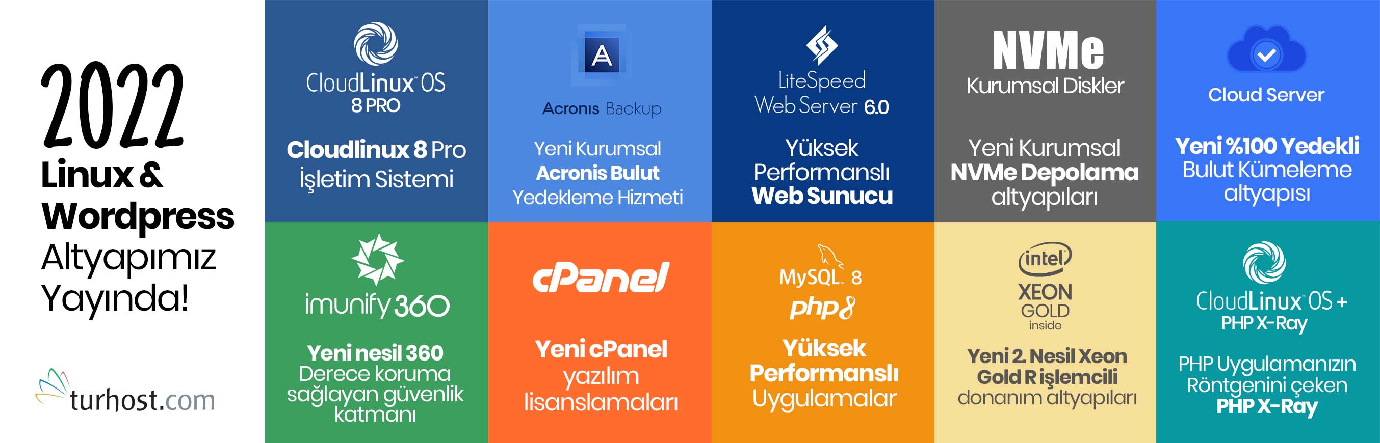 Cloudlinux 8 Pro İşletim Sistemi, Imunify 360, yeni Kurumsal Acronis Bulut Yedekleme hizmeti ve yeni Kurumsal NVMe Depolama altyapıları gibi çok sayıda yapılandırmayla güvenlik ve performans odağını yükselten Turhost, orjinal yazılım kullanımının da altını çizmekte.