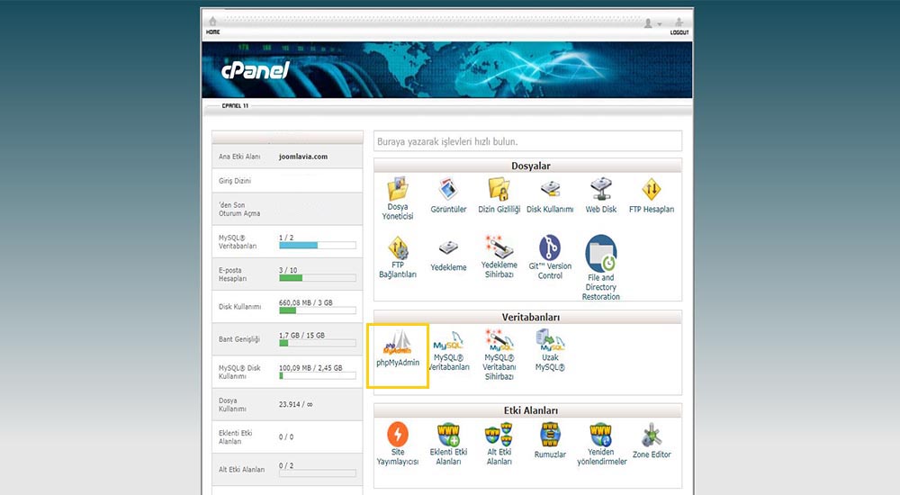 1. ADIM: Kullanmış olduğunuz sunucu paneli üzerinde yer alan phpMyAdmin yazılımını açalım.