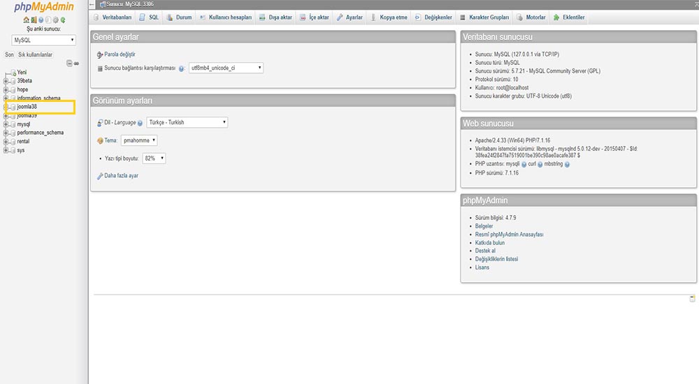 2. ADIM: phpMyAdmin yazılımını açtıktan sonra, ekranın sol tarafında yer alan Veritabanı kısmından Joomla! sitenize ait Veritabanı'nı seçin.