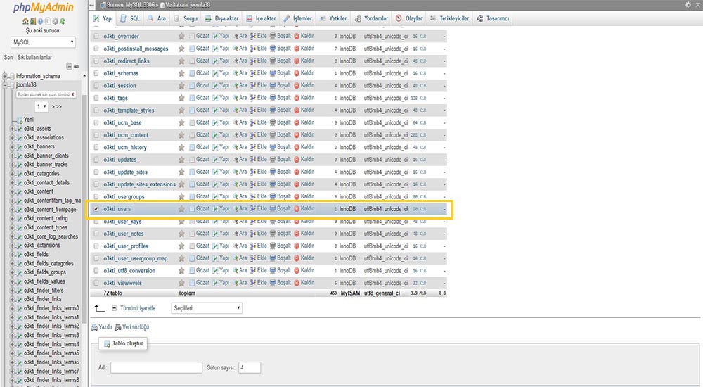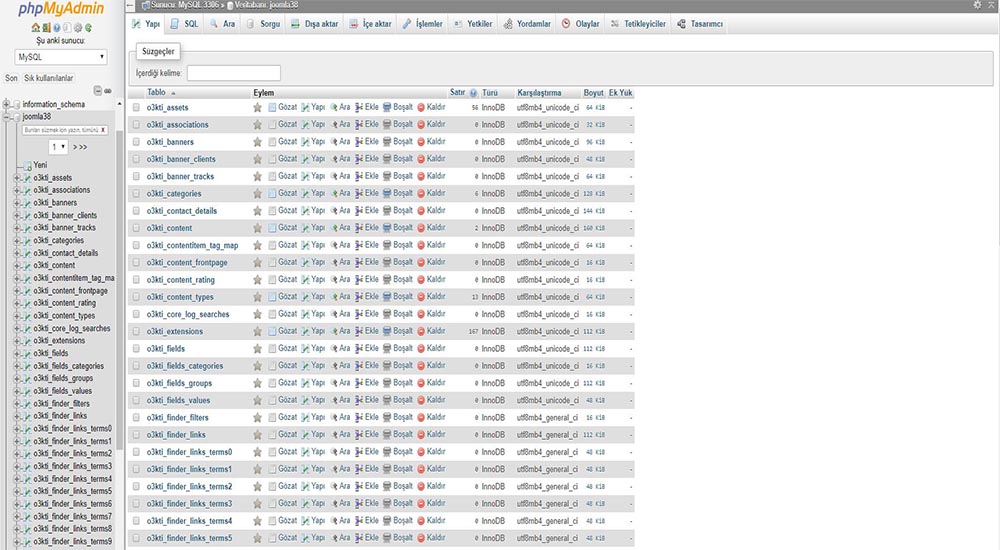 3. ADIM: Joomla! sitenize ait Veritabanı'nı seçtikten sonra karşımıza tabloların olduğu alan gelecektir.