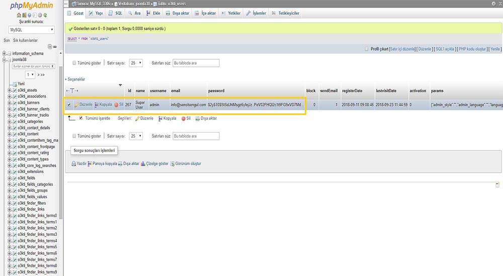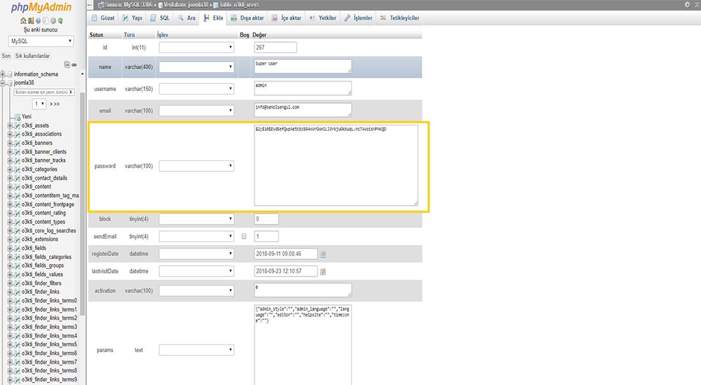 Bu gibi durumlarda şifreyi Joomla! Veritabanı üzerinden değiştirmek mümkündür, böylece Süper Yönetici olarak tekrar oturum açabilirsiniz. Bunlar Joomla! yöneticileri için olası yöntemlerdir.