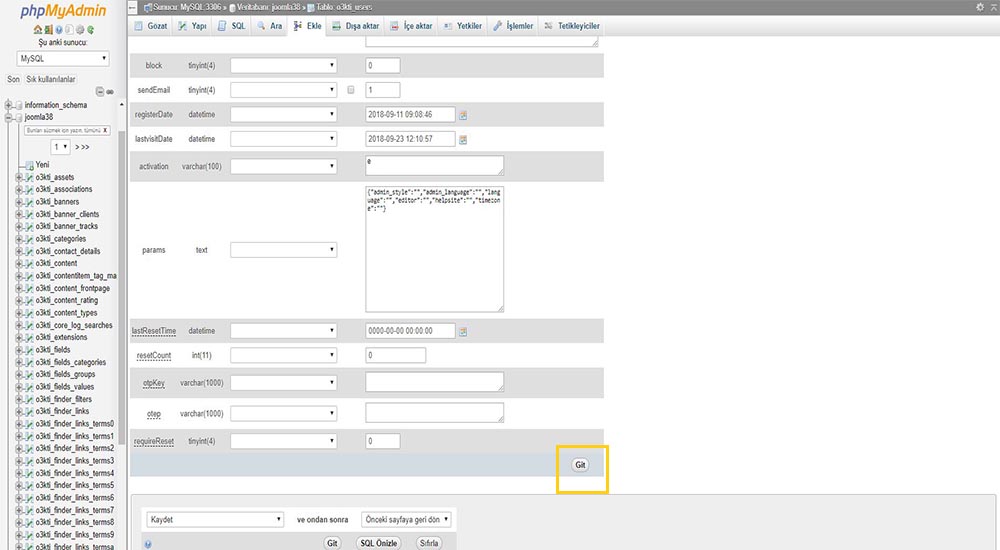 İPUCU: 6. adım'daki "password" alanının sağ tarafındaki alana dilerseniz yeni şifrenizi direk olarak yazıp, ardından sol tarafta bulunan açılır kutucuktan MD5 seçeneğini seçip "GİT" butonuna basarak işlemi sonlandırabilirsiniz. Böylelikle phpMyAdmin şifrenizi MD5 algoritması ile kodlayacaktır, MD5 web sitesi üzerinden karmaşık şifre oluşturmak zorunda kalmayabilirsiniz.