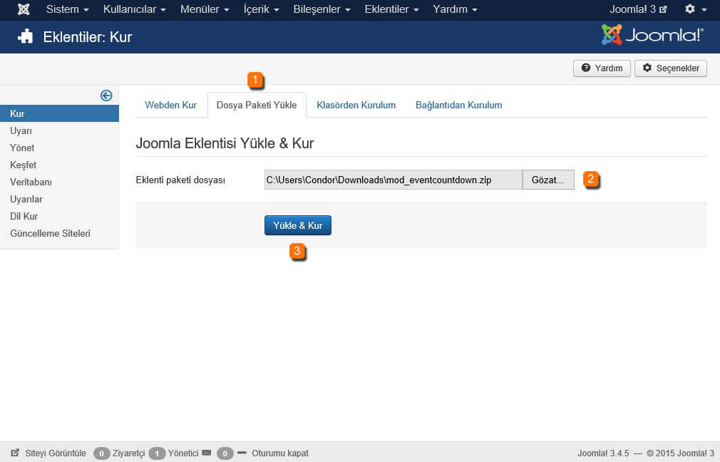 Eklentiler üst menüsü altında "Yönet" kısmına giriş yapın. Bilgisayarınız'daki "zip" dosyasını bulmak için "Gözat" butonu'nu kullanarak dosyayı seçin, ardından "Yükle & Kur" butonu'na basarak kurulum işlemini gerçekleştirin. İşlem tamamlandığında başarıyla tamamlandı iletisini göreceksiniz.