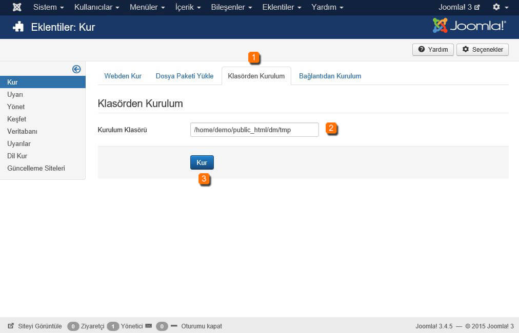 Büyük boyuttaki eklentileri yüklemek için bu yolu tercih edebilirsiniz. Dosyanızı sunucunuza yükledikten sonra kurulum için klasör yolunu yazarak "Kur" butonu'na tıklayın ve kurulumu gerçekleştirin... İşlem tamamlandığında başarıyla tamamlandı iletisini göreceksiniz.