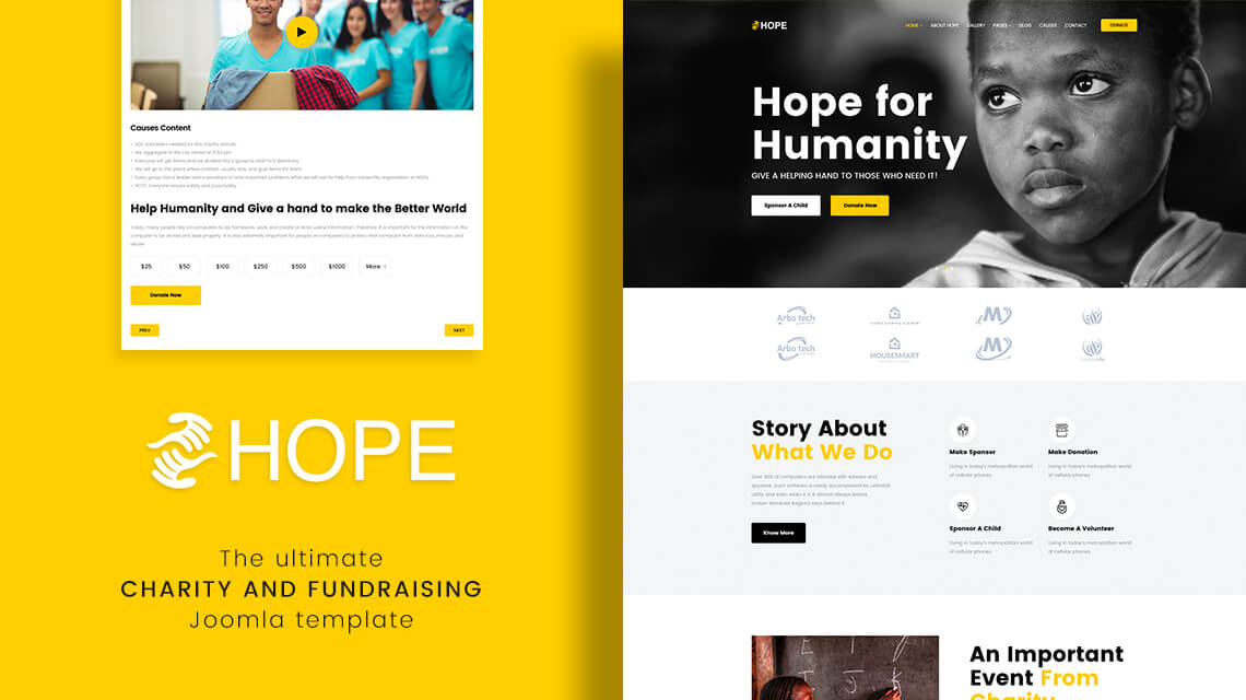 Hope Joomla! Tema, STK'lar, kuruluşlar, kar amacı gütmeyen kuruluşlar, fon toplama, sosyal hizmet grupları ve diğer ilgili projeler için yardım amaçlı web siteleri oluşturmak için kullanabileceğiniz modern, duyarlı ve tam teşekküllü bir Joomla! şablonu'dur.