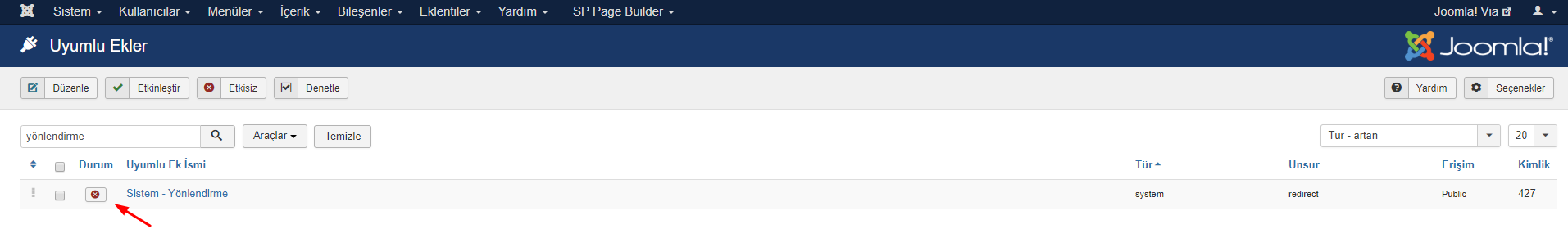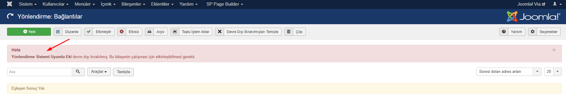 Bu sizi eklentinin etkinleştirilmediğini belirten bir hata mesajı bulabileceğiniz web sitenizin Yönlendirme paneline götürür.