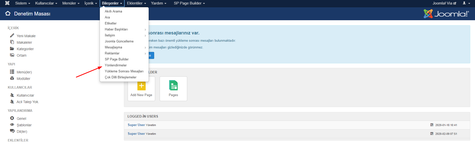 Veya sadece web sitenizin Yönlendirme bileşeni alanına gidebilirsiniz. Joomla! admin paneli alanındaki üst menü'den Bileşenler> Yönlendirmeler 'e giderek.
