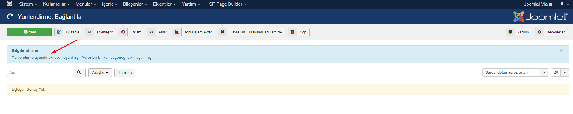 Yeniden Yönlendirme eklentisini etkinleştirdikten sonra, "URL Topla" seçeneğinin etkin olduğunu gösteren daha fazla hata mesajı olmadığını göreceksiniz.