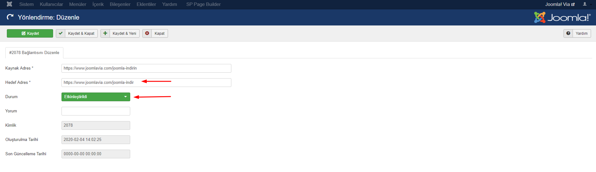 Eski bağlantıyı "Kaynak Adres" alanına girin, ardından "Hedef Adres" alanına yeni güncellenmiş bağlantıyı girin. Ardından işiniz bittiğinde "Kaydet ve Kapat" butonuna basın.