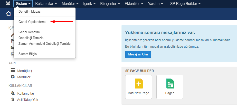 Adım 1: Sitemizin Joomla! yönetici alanına giriş yapıp Sistem> Genel Yapılandırma 'ya gitmemiz gerekiyor.