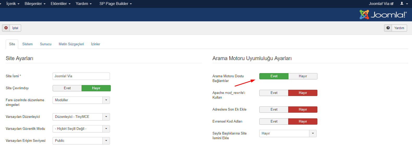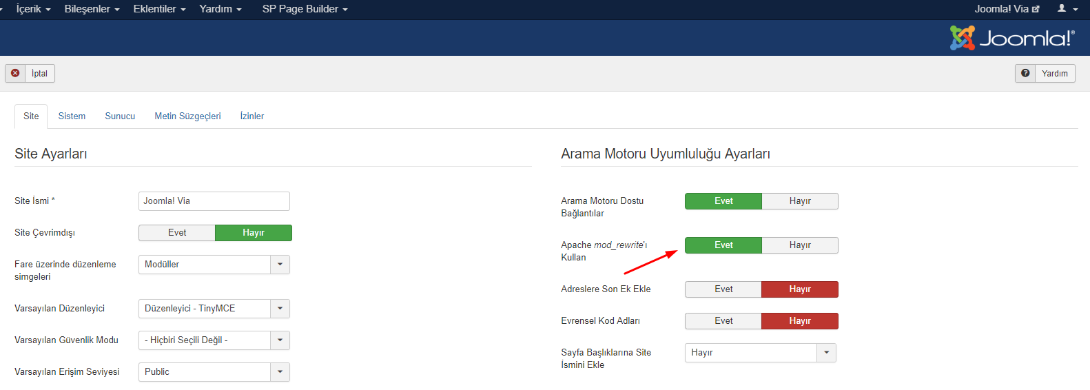Adım 4: Şimdi Joomla! yönetici alanımıza geri dönelim ve SEO Ayarları'nı (Sistem> Genel Yapılandırma) bulalım. "Apache mod_rewrite'ı Kullan" kısmını "Evet" olarak ayarlayacağız.