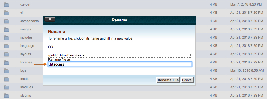 Burada htaccess.txt dosyası'nın ismini .htaccess olarak değiştireceğiz.