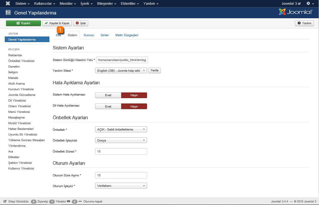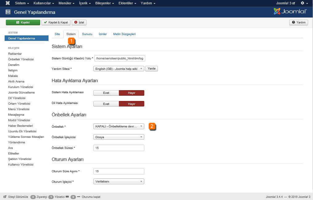 ADIM 2: Genel yapılandırma kısmına giriş yaptıktan sonra "Sistem" bölümüne giriş yapıyoruz. Bu bölümde "Önbellek Ayarları" kısmının hemen altında "Önbellek" açılır kutucuğundan "AÇIK-Sabit önbellekleme" veya "AÇIK-İlerlemeli önbellekleme" seçeneğini seçiyoruz.
