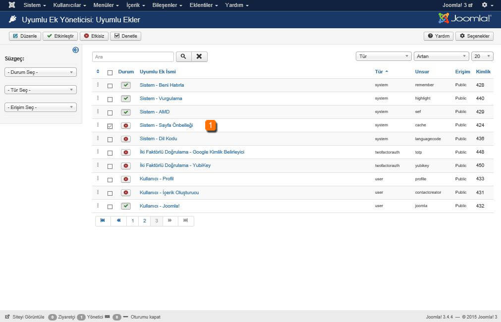 ADIM 4: Üst menüde bulunan "Eklentiler" menüsü adı altında "Uyumlu Ek Yöneticisi" kısmına giriş yapıyoruz. Burada "Sistem-Sayfa Önbelleği" uyumlu ekini aktif konuma getiriyoruz.