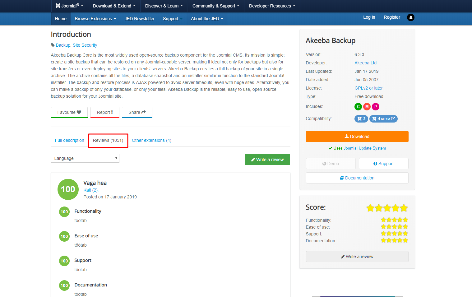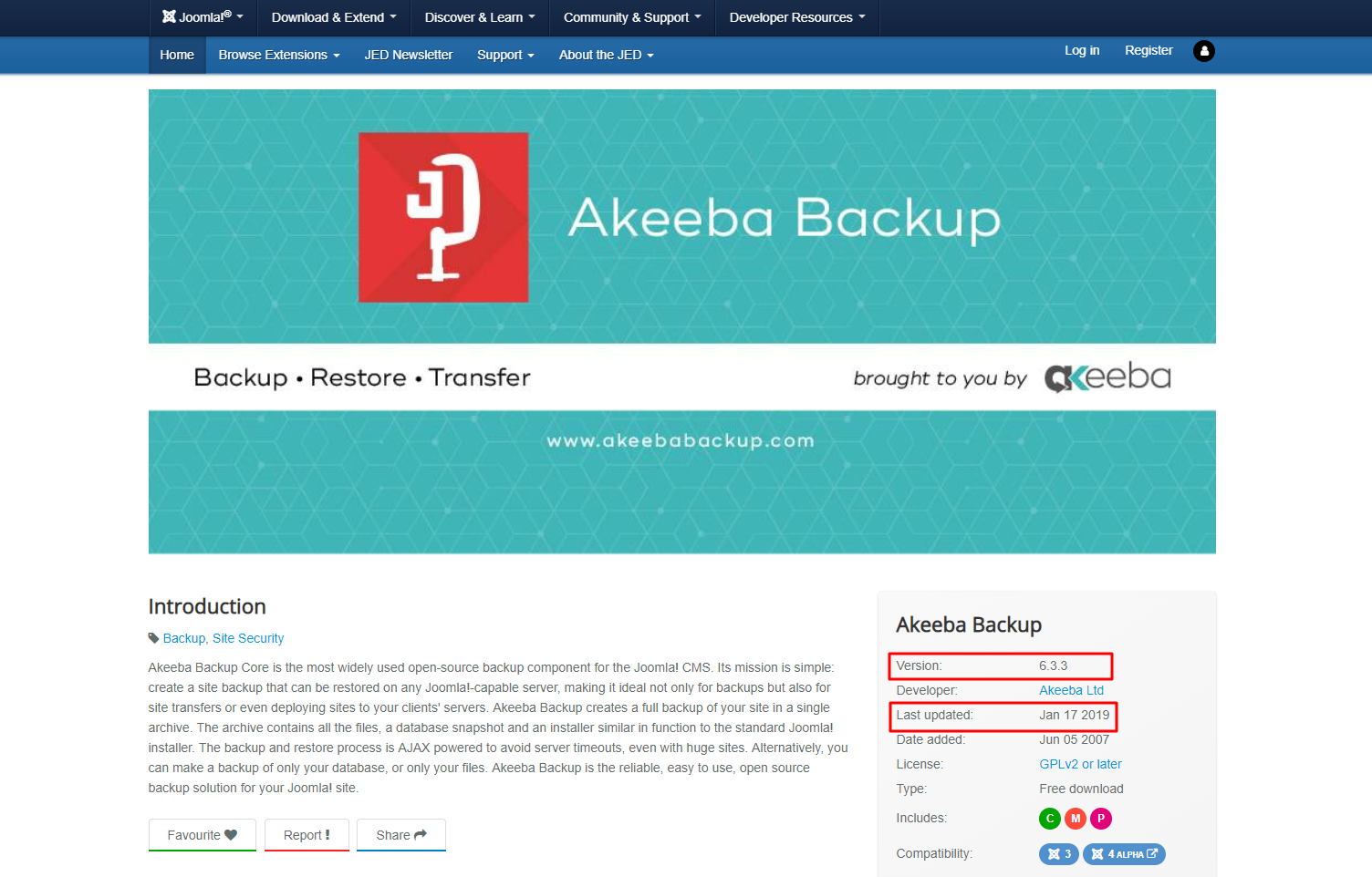 Bu önemlidir, çünkü bir yıl veya daha uzun bir süredir güncellenmemiş güncel olmayan eklentiler, terk edilmiş projeler olma eğilimindedir ve bu nedenle web siteniz için güvenlik riski oluşturur. Aşağıdaki resimde göreceğiniz üzere, Akeeba Backup eklentisinin son sürümünü ve güncelleme tarihini görebilirsiniz.