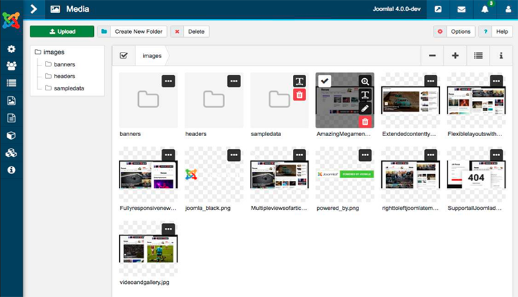Joomla! 4 tamamen yeniden oluşturulmuş Medya Yöneticisi ile birlikte gelir. Medya dosyalarını kolaylıkla yönetmek için daha gelişmiş özelliklere ve gelişmiş çalışma paneline sahip yeni medya yöneticisi.
