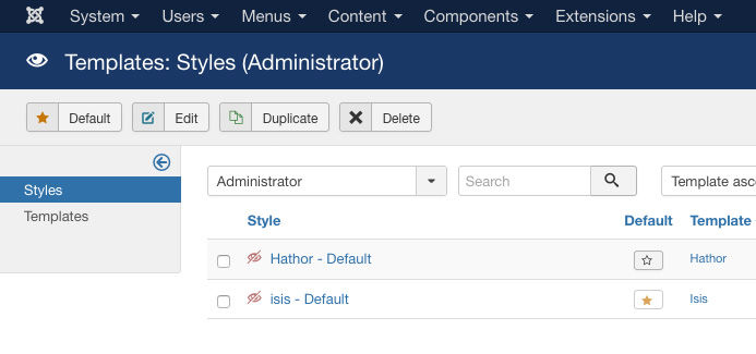 Ön uç şablonuyla aynı olan Joomla! 3, 2 yönetici şablonunu destekler: Hathor ve Isis. Her ikisi de Bootstrap 2, LESS CSS'ye dayanmaktadır.