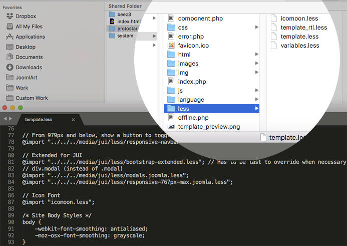SASS ve LESS'in ikisi de çok güçlü CSS uzantılarıdır. CSS'i daha iyi korunabilir, temsili ve genişletilebilir yapmak için tasarlanmış programlama dilleridir. Bootstrap 2'yi entegre ederek, Joomla! 3 LESS ile geliştirildi.