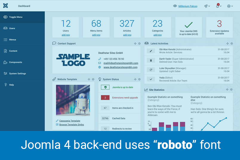 Kullanıcı grafiği kullanıcı arabirimi Joomla! 4'te değiştirildi ve iyi bir görsel haline gelmenin önemli bir parçası oldu. Joomla! geliştiricileri, hafif, normal, kalın ve siyah ağırlık stiliyle yönetici paneli için popüler web fontu olan Roboto'yu kullanmaya karar verdiler.