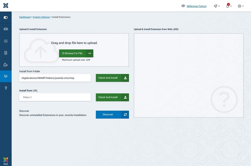 Joomla! 4'te uzantı kurulumu aynı sayfa üzerinde, uzantıyı, klasör'den ve URL'den bir dosya sürükleyip bırakarak kurabilirsiniz.