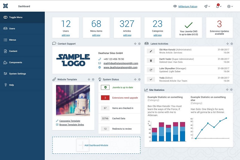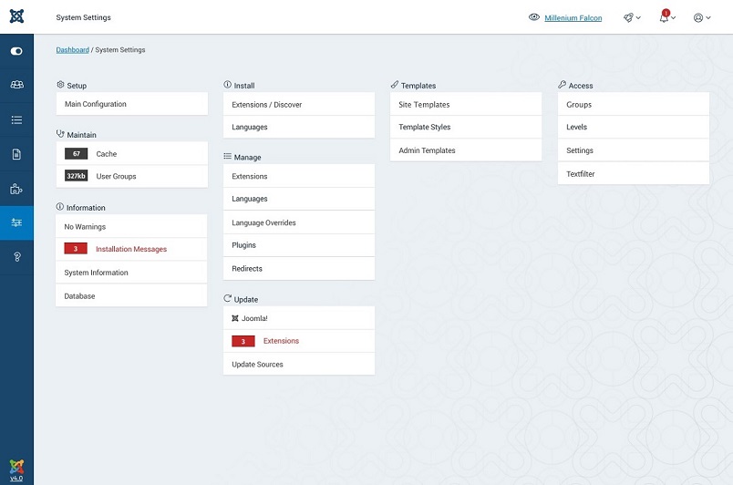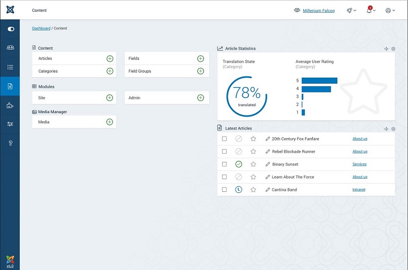 Joomla! CMS'de günlük iş akışını daha kolay hale getirmek için, kullanıcı arabiriminde pek çok gelişme ve yeni bir özellik ile birlikte gelen yeni bir Arayüz Joomla! 4 admin gösterge tablosu. Tüm Menüler, yeni kenar çubuğuna eklenir. Arka uç gezinme, kullanıcı menüsü, içerik, medya, bileşenler ve şablonlar arasında gezinmeye yardımcı olan daraltılmış bir seçenekle birlikte artık kenar çubuğundadır. Sağ üstte site önizlemesi, özel mesaj, bildirimler ve kullanıcı arayüzünü yumuşak bir dokunuş haline getiren kullanıcı düğmeleri bulunuyor.