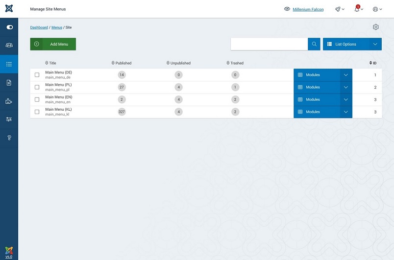 Joomla! 4, esnek bir menü sistemine sahiptir. Gösterge tablosundaki katlanabilir kenar çubuğu, menü öğesinde tek bir tıklama / gezinme ile tüm seçenekleri verir. Yeni Joomla'da birçok menü öğesi bir menü öğesine birleştirilir. Her menü öğesiyle size yeni bir öğe ekleme seçeneği sunan bir Artı simgesi göreceksiniz, bu özellik esnekliği geliştirir ve Joomla'daki öğeleri yönetirken hızlı olur.