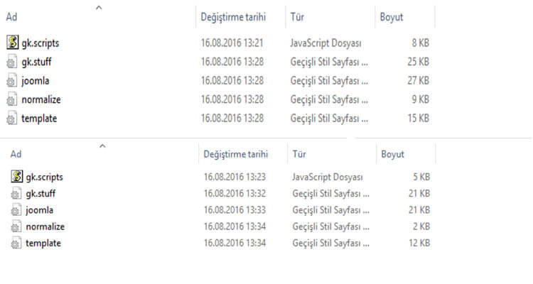 Joomla! sitelerimizde bulunan CSS ve JavaScript dosyaları her ne kadar ufak boyuta sahip olsa da, CSS ve JavaScript dosyalarını sıkıştırma yöntemi ile daha da ufak boyuta indirmek mümkün. Örnek vermek gerekirse 9 kb'lık bir dosyayı sıkıştırdığımızda, 2kb'lık bir boyuta indirmek mümkün. Böylelikle 7kb'lık bir tasarruf elde etmiş olursunuz. Aşağıdaki resimde görmüş olduğunuz dosyaları denemek amaçlı sizler için sıkıştırdık, aradaki farkı görmek için inceleyebilirsiniz.