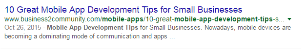 Aşağıdaki resimde, bir aramanın mobil uygulama geliştirme ipuçlarını aradığı bir sonuç görebilirsiniz ve sonuç arama sorgusuyla eşleştikçe, Google meta açıklamasında kullanılan anahtar kelimeleri vurguladı. Yerel SEO için, yerel arama için daha da uygun hale getirmek amacıyla açıklamanıza şehir ve eyaleti eklediğinizden emin olun.