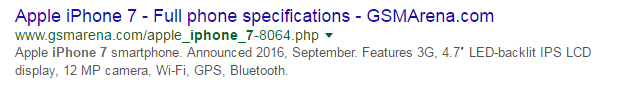 Bir aracı tanıtıyorsanız, meta açıklamasını yazarken ürünün teknik özelliklerine odaklanmanız gerekir. Bu, arama yapanlara ürünün ne hakkında olduğu ve ne sunduğu hakkında net bir fikir verir. GSM Arena'nın iPhone 7'nin ayrıntılarını meta açıklamada nasıl bahsettiğini görebilirsiniz. Bu ürünü arayan müşterileri bilgilendirmek ve ikna etmek için kamera, tasarım, piyasaya çıkış yılı, ekran ve diğer özellikleri hakkında detaylar ekler.