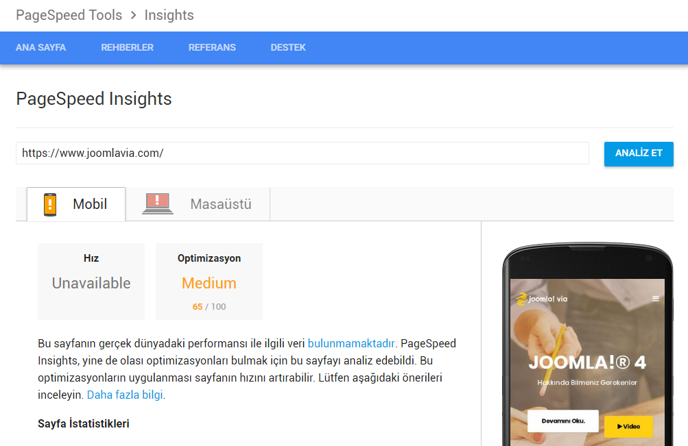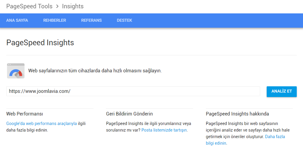 Joomla! sitenizi hızlandırmak için yapmanız gereken ilk şey, bulunduğunuz yeri bulmaktır. Tavsiye edeceğim araçlardan biri, Google'ın ücretsiz sunmuş olduğu PageSpeed Insights hizmetidir. Bu harika bir araçtır. Sadece site URL’nizi girin ve sonuçları hemen elde edersiniz.